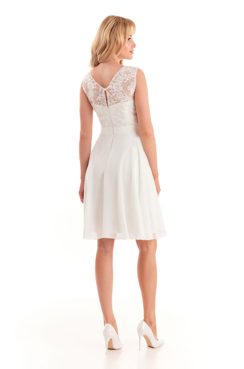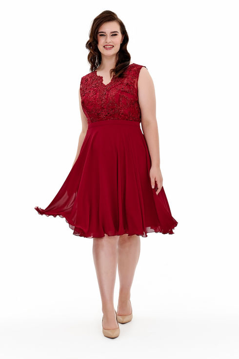 Ein edles Cocktailkleid mit Spitze und einem luftig schwingenden Rock. Das Dekolleté wird von einem schönen V-Ausschnitt mit Spitzenbesatz umspielt und in Szene gesetzt. Ein schmales Band betont die Taille, während der leichte Rock in perfekter Länge zum Tanzen einlädt. Dieses Kleid vereint Eleganz und Komfort und ist perfekt für besondere Anlässe geeignet.